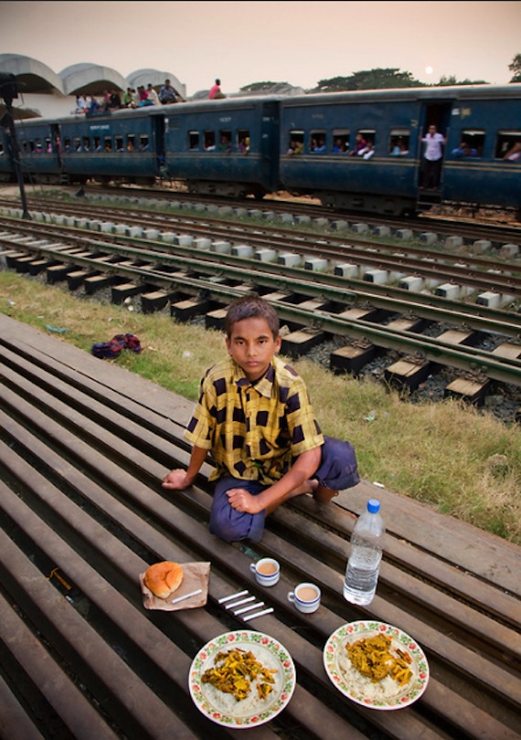 Shashi Kanth, un trabajador de call center con su comida diaria en su oficina en el centro de atención telefónica de AOL en Bangalore, India. Kanth mide 1.73 m y pesa 55 kg. Como muchos de los miles de trabajadores de call center en la India, se alimenta de comidas rápidas, golosinas y café para soportar las largas noches que pasa hablando con los occidentales sobre diversas cuestiones técnicas y problemas de facturación. Inicialmente se introdujo en el mundo del call center para pagar facturas médicas y escolares, pero después de dos años se encuentra todavía allí sin saber cuándo va a volver a sus estudios profesionales.